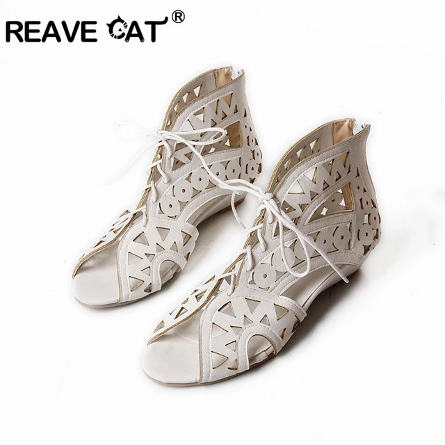 REAVE CAT Big Size 34-43 Cut out Gladiator Hollow Lace Up Zipper Women Sandals Open Toe Low Wedges Bohemian Beach Shoes