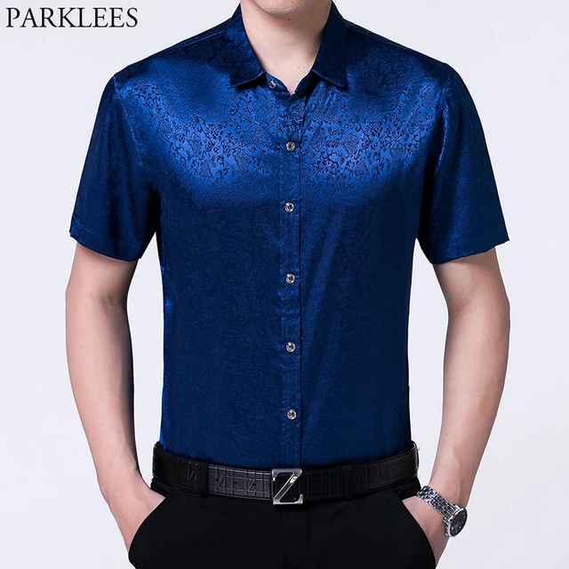 Royal Blue Silk Satin Dress Shirt Men Stylish Floral Print Slim Short Sleeve Tuxedo Shirt Male Business Wedding Party Chemise